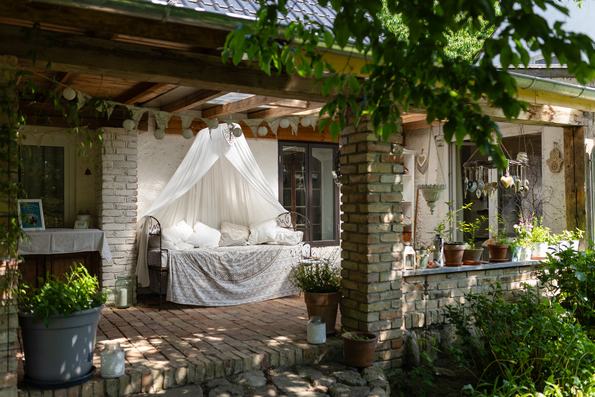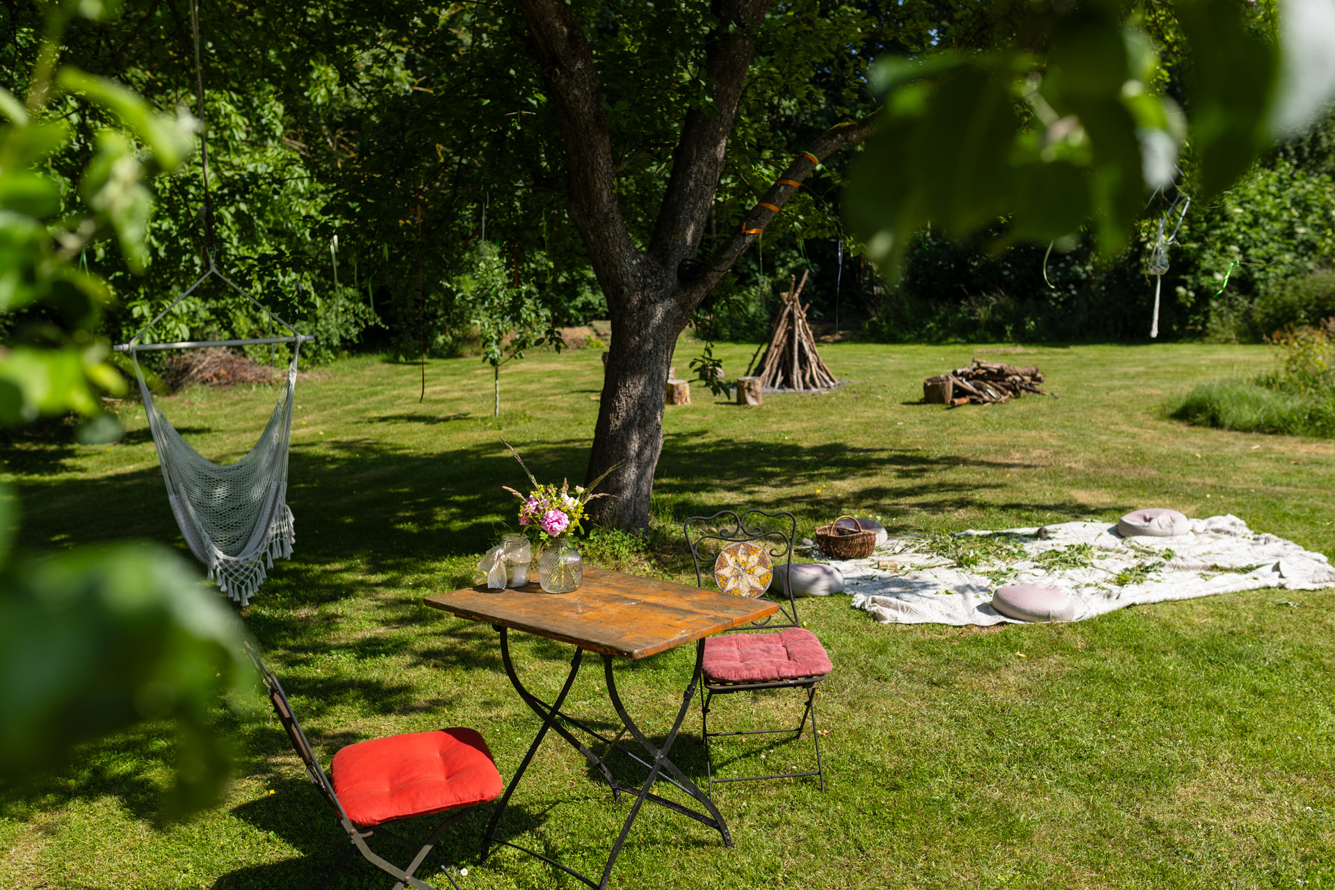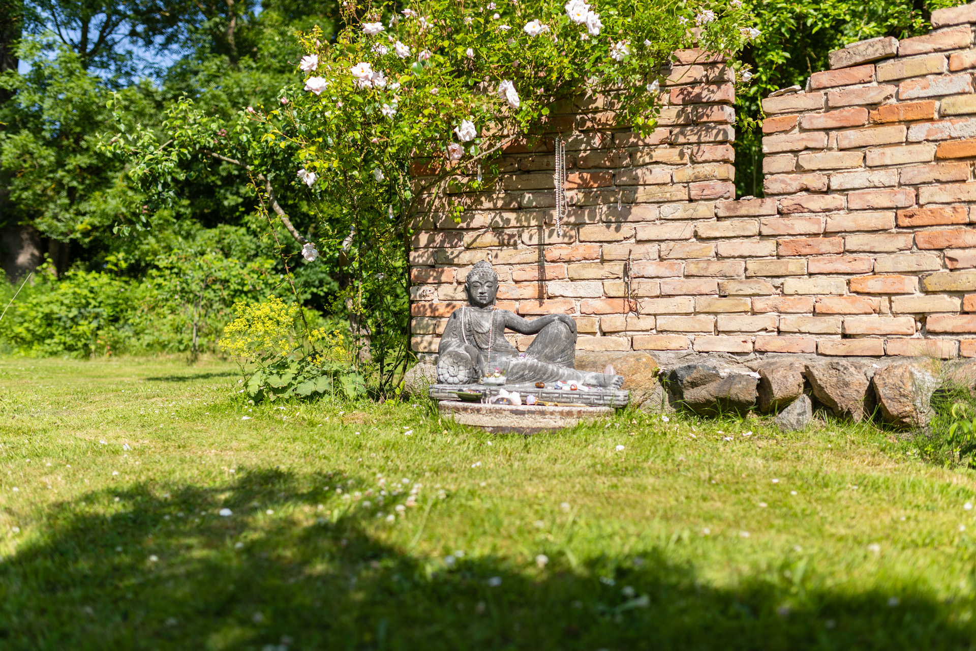 Der große verzaubernde Garten lädt an jeder Ecke zum Verweilen ein. Und vor Allem zum Barfuß-Laufen. Rosen duften in allerlei Farben, Bäume spenden frischen Schatten, in den Hängematten kannst Du mit den Rhythmen des Lebens schwingen und die Katzen Frido und Struppi schützen mit ihren Spirits Haus und Hof.  Angrenzend lädt ein großer malerischer Wald zu ausgedehnten Spaziergängen ein. Der Pregel-Bach glitzert still und erzählt seine Geschichten. Wenn Du lauschst… Das hier mit all Deinen Sinnen zu erfahren, lässt Dein Nervensystem jubeln, es breitet sich eine tiefe Ruhe in Dir aus und Du spürst hier so unmittelbar und pur: Ich bin nicht allein! Ich bin eingewoben in dieses Gewebe aus den Elementen.